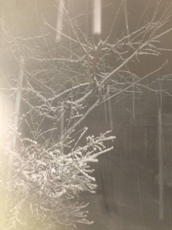 С утра был снег с дождём,сейчас все успокоилось,просто пасмурно.Хорошо,деревья пока не распустились,на абрикосах и нектарине сильно набухли почки.