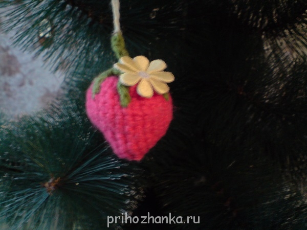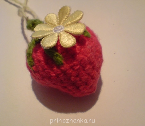 Нашла в своих рукодельных завалах клубничку которую давно вязала крючком. Вспомнила, что у меня есть аппликации - цветочки и пришила один цветочек.