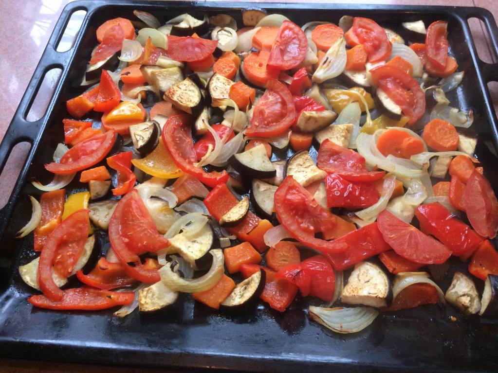 немного п.масла. Все перемешала выложила на противень разложила сверху помидор и в духовку на 25 мин. Вынимаешь, остужаешь сверху выжать сок из лимона или чуть уксуса, можно выдавить чесночек. Овощи переложить в посудину и дать немного постоять. Все! Ангела за трапезой!