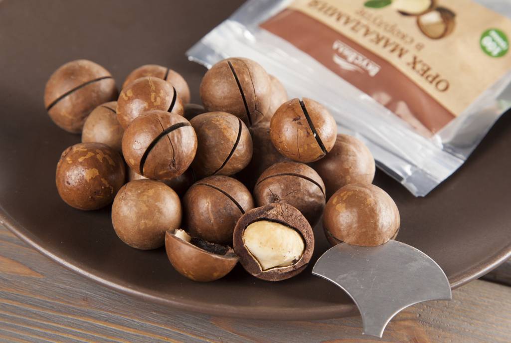 Макадамия стала продаватся совсем недавно. Нежный вкус, похож на сахарное печенье. К орешкам прилагается металлический ключик для комфортного открывания. Растёт он в Австралии, судя на ссылкам.