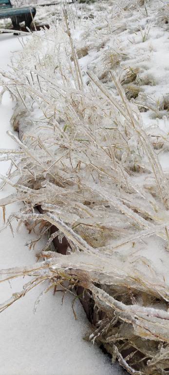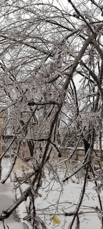 Автомобили и всё что на улице покрыто льдом. Только и слышно, как обламываются ветки деревьев. Некоторые районы города без света, оборвались провода. Ледяной дождь продолжает идти.