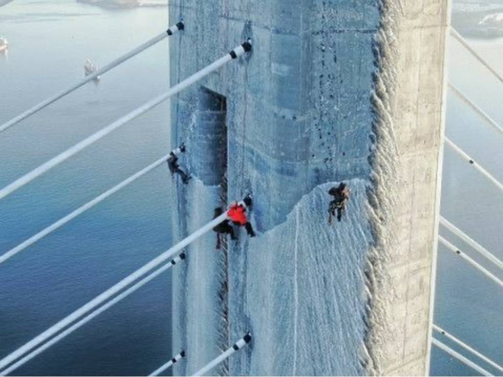 Вот такие ребята, промышленные альпинисты спасли наш мост на о. Русский. Вручную долбили лед с вант, находясь по нескольку часов на огромной высоте, где мороз сильнее и ветер. Для нас они настоящие герои. В воскресенье движение по мосту открыли, губернатор наградил ребят.