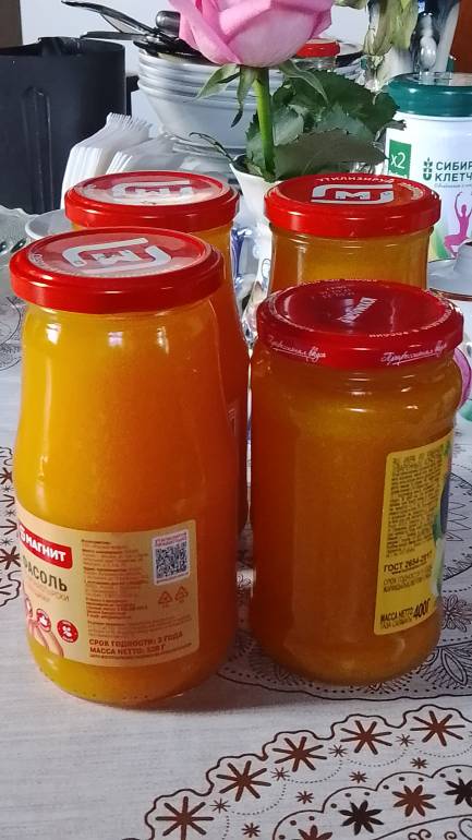 Оказалось, что дома не осталось лимонной кислоты, лимонов тоже не было, пришлось применить яблочный уксус 1 ст.л. Сделала по рецепту выше на пробу из 1кг тыквы, получилось ровно 2 л сока, разлила в баночки и осталось пара глотков на пробу - вкусный. Но дальше делать муж отговорил, мол, тыква хорошо лежит, даже разрезанная в холодильнике с неделю хорошо хранится, сок можно сделать в любой момент, к тому же свежевыжатый и без сахара, полезнее, да и апельсины купить тоже к нему всегда можно. В общем, этот сок на пробу, наверное, будет единственным закатанным. Хотя, всё-таки, может быть, ещё сделаю, но не под закатку, а сразу пить, очень уж вкусный.