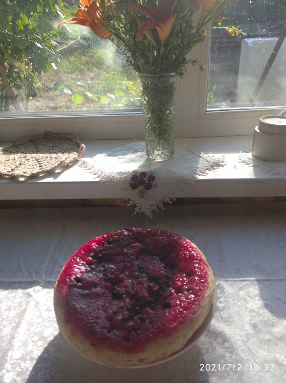 Сейчас по подобному рецепту пеку и манники и пироги с любого сока(только водой редко разбавляю). Чаще всего с яблочного домашнего это основа, добавляю какао и мороженую вишню (иргу часто, черную смородину) с крахмалом. Это фаворит у сына и мужа. Сверху мажу шоколадом. Практически торт. Вкуснее на второй день, но редко доживает.
