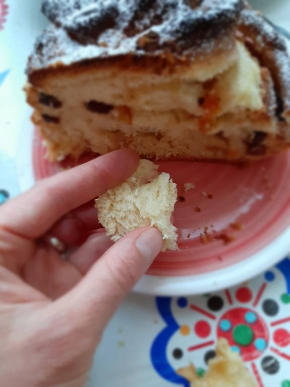 П.с. я вымешивала 2 раза(у автора один замес) и подходило у меня два раза по часу и еще около часа на расстойке, по выходу - 4 куличика по 450 грамм примерно, из порции как в рецепте( 2яйцаплюс три желтка,200мл.молока, в районе 750грамм муки и т.п.). У автора дрожжи сухие. Я не рискнула, взяла свежие. На эту порцию пошло полторы пачечки 25граммовые(37 грамм примерно).
