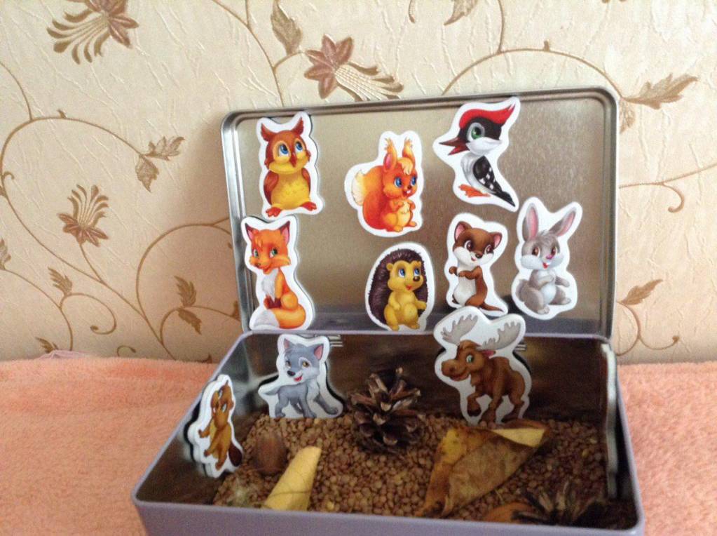 Мы сегодня игрались с такой сенсорной коробочкой "Осенний лес". Такие картинки на магнитах просто зачет!