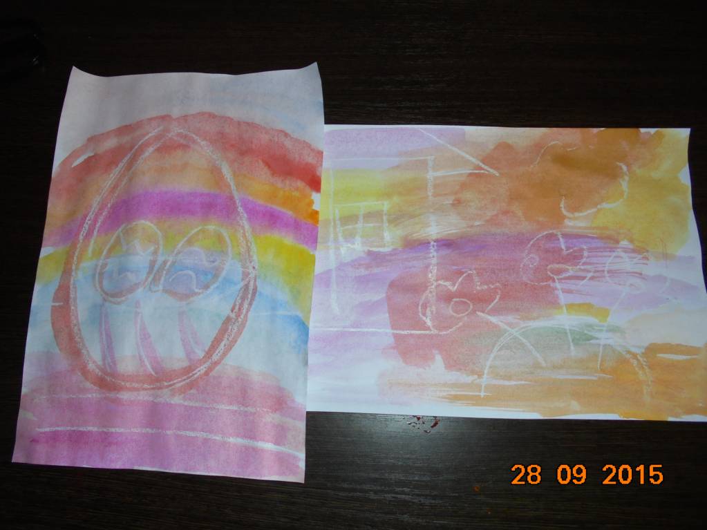 Идею взяла в ВК. Свечкой рисуем любой рисунок,дети наносят краску. Моим очень понравилось