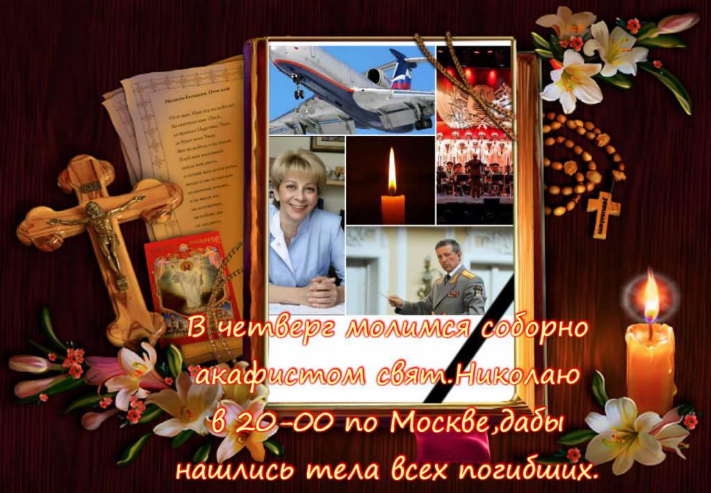 Мы будем молиться соборно по соглашению в четверг , 29декабря, акафистом свят.Николаю в 20-00 по Москве,о погибших в авиакатастрофе,дабы нашлись тела всех для погребения их в родной земле...Передайте это другим...