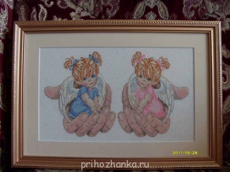 А дальше, нам сообщили брат мужа, что они ожидают второго ребёночка и мне захотелось их порадовать вышивкой. Мама утверждала, что будет девочка и я решила вышить ангелочков-девочек, но когда я уже вышила, родился мальчик и поэтому я для них в подарок вышила младенца на руке.