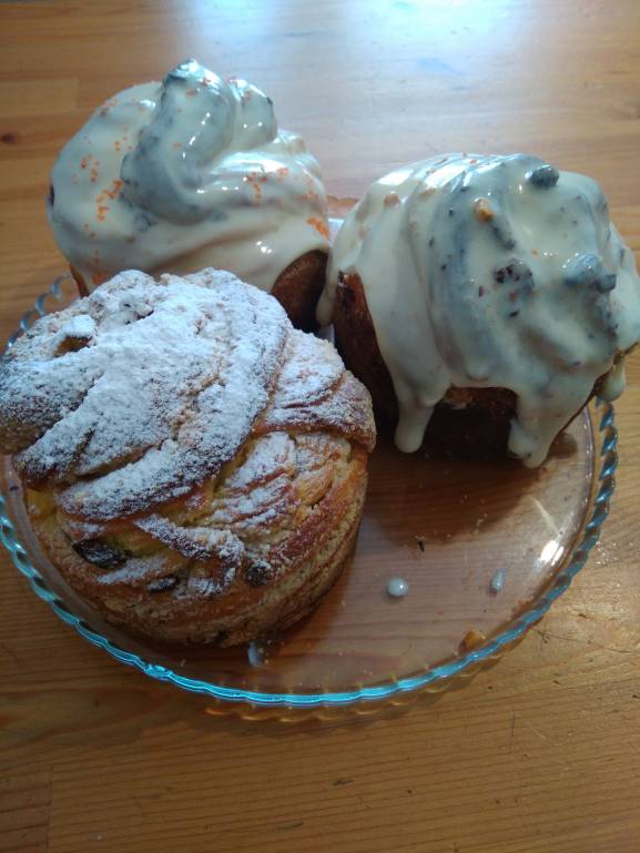 Сухие сливки почти закончились, вместо 4х ложек всего одна, поэтому сгущёнку загустила ещё и кокосовой стружкой .Получились синнабоны.