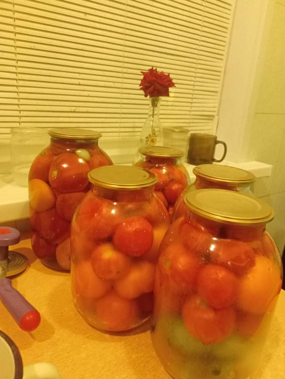Сегодня собрали 4 ведра помидоров, уже многие кусты засохли. Если и будут ещё, то немного совсем. Закатала всего 3 банки трёхлитровые, некогда было больше возиться