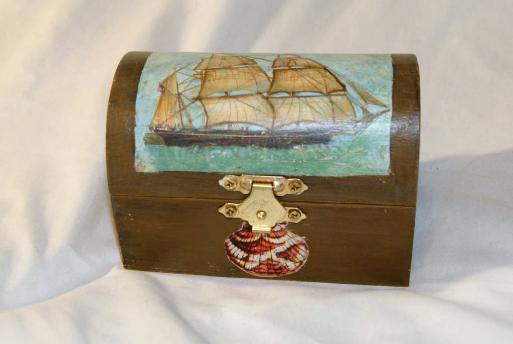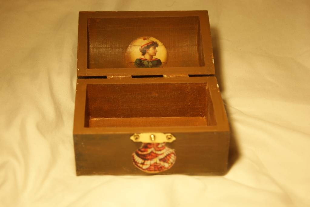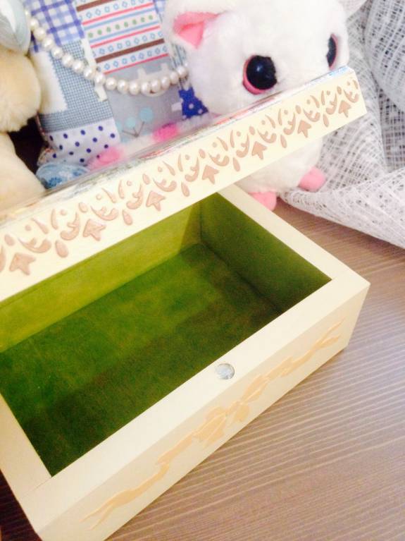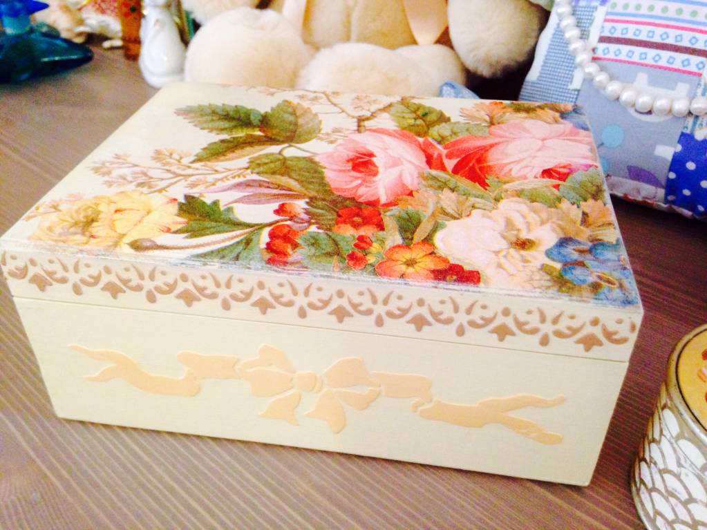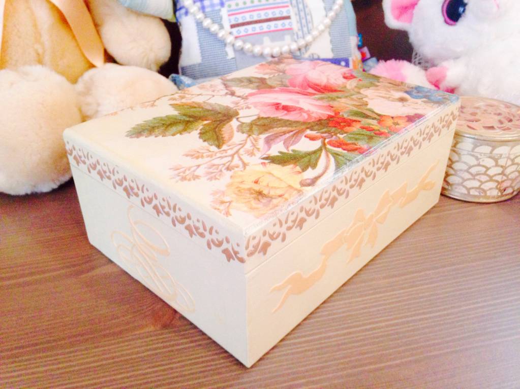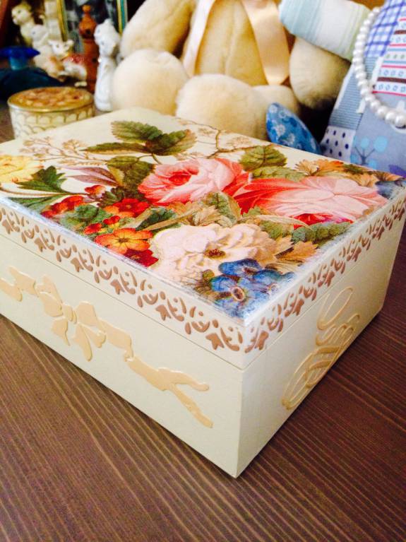 Пион Пионыч, на лечке и подносе салфетки, на сундучке фрагмент декупажной карты.
