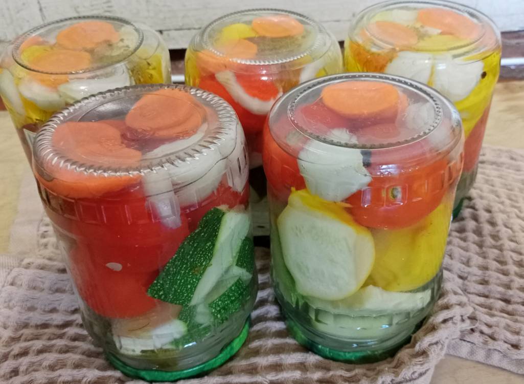 Также вчера у тетушки закатали несколько небольших баночек моего любимого маринованного ассорти с помидорами. В прошлом году меня угощали патиссонами, я их закатала с помидорами, и тетушке они очень понравились. Тут на днях меня (в ответ на тяжёлые вздохи, что забыла купить семена патиссонов, а ведь хотела посадить...