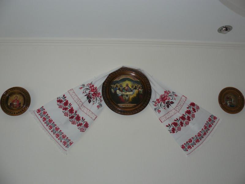 В одной комнате большой на стене, во второй - на полочке просто стоят иконы