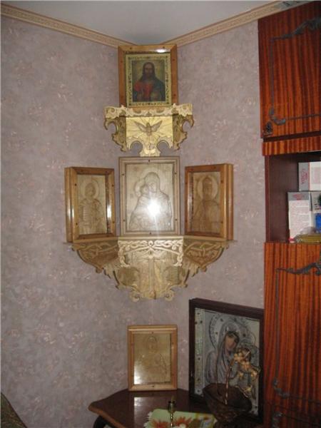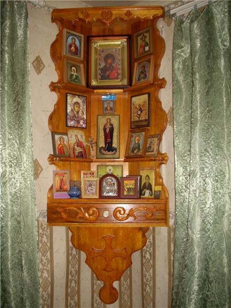 У меня два иконостаса.Один в прихожей,в углу ,на специальной полочке,другой в спальне.Муж с меня смеется,говорит,что домой заходишь,как в церковь,даже в кухне висят.Я считаю,что в каждой комнате иконы должны быть.К этому я родных сразу приучила.