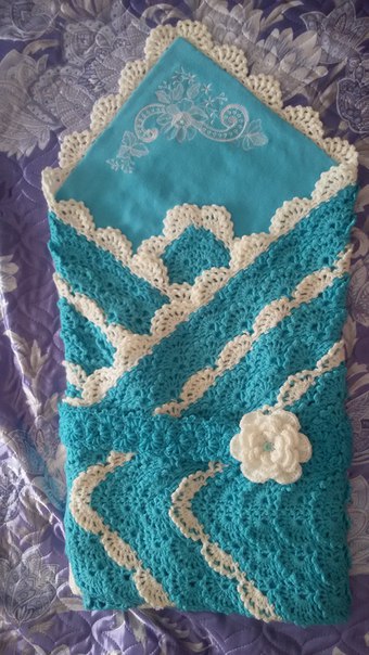 Вот мой пледик-конверт на выписку. В уголке машинная вышивка на трикотажном подкладе.
