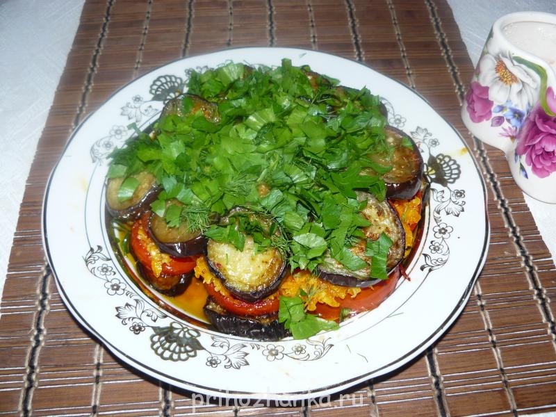 Баклажаны и помидоры порезать кольцами, поджарить на постном масле. Натереть на тёрке морковь и тоже поджарить. Добавить в морковь тёртый чеснок. Потом выложить на блюдо сначала помидоры, потом морковь, потом баклажаны, потом снова морковь и т.д. чередовать. Вверху должен быть слой баклажан. Сверху присыпать рубленой петрушкой.