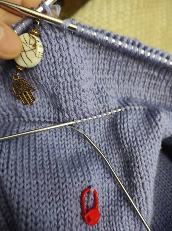 Ой, точно, забыла отчёт....Свитер уже на резинке. Чуть-чуть осталось, но пока его отложила.... Останутся рукава. Ну и без роспуска не получилось. По схеме можно было сделать удлинение спинки. Так и собиралась. Но в итоге не понравилось. Были заметны петли разворота в поворотных рядах. Поэтому кусок приличный пришлось разбросать и вязать просто прямо. То что связано- от красного маркера. Это вышло 17 см. Ну и на 2 фото видно сколько распустила( до вторых спиц).