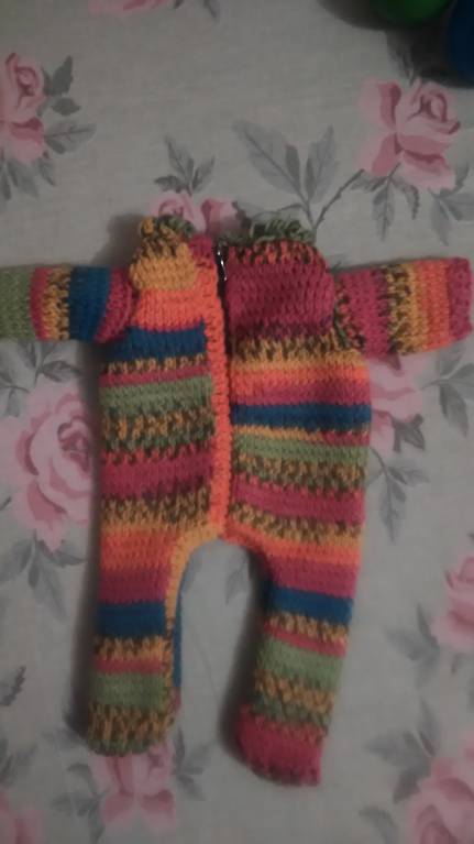 Потом связала костюм ясельный для Вариной куклы. Тут я научилась делать прибавки по краю полотна и поняла, как снимать кромочную петлю, чтобы оба края были красивыми косичками