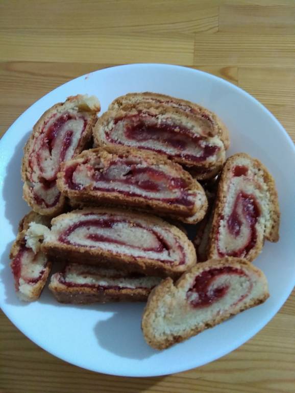 Замесила песочное тесто, достала повидло типа клюквенное, хотя не пойми , из чего на самом деле. Чтоб поменьше возиться, свернула рулетики. Ждём-с.