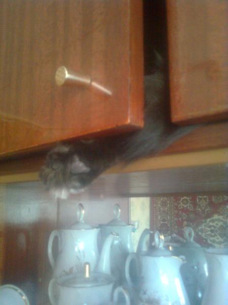Он попросился, такими глазками смотрел, так просился, что не устояла я и подсадила, а затем дверки закрыла. А котька еще и открывал их, чтоб видеть весь зал. Потом заснул и ему видно тесно стало вот и лапу выставил!Юлия:Ладушка,![]()