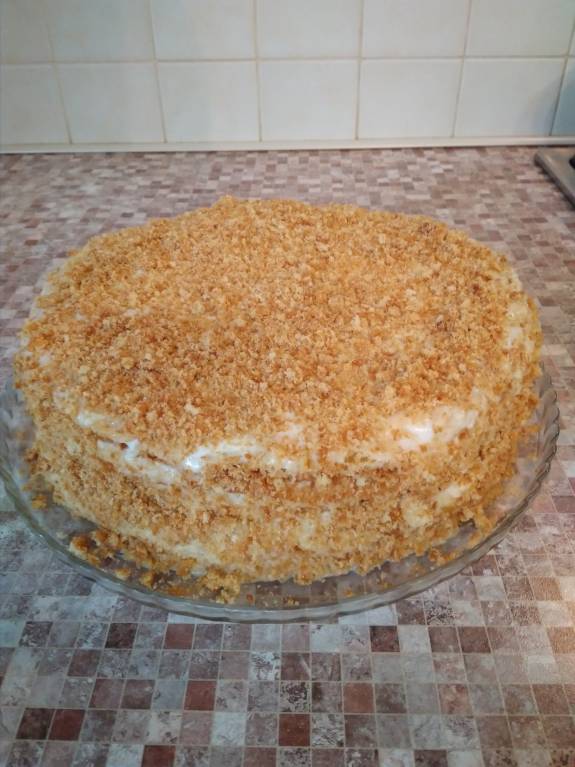 Раскатать первый кусок теста,вырезать круг плоской тарелкой, обрезки не снимать, а выпекать вместе с кордом.Потом ими посыпать торт.Чтоб корж не вздулся, наколоть его вилкой.