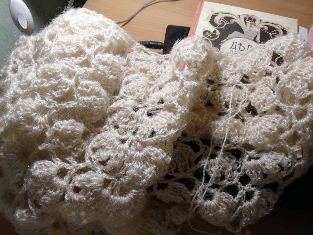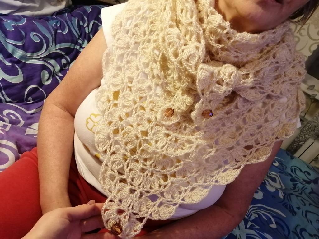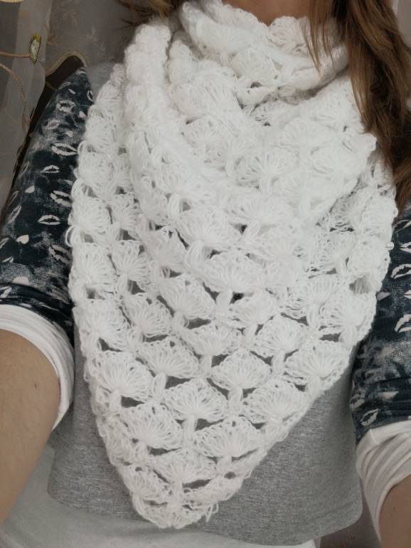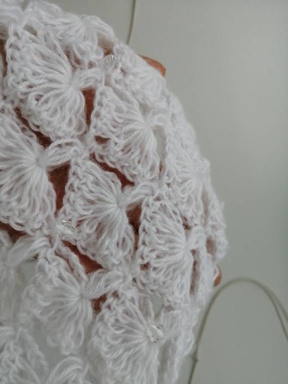 Придумала на углы бактуса нашивать такие вот бусины с гранями, так углы легче ловить. И вообще такие красивые углы можно уже не вовнутрь прятать, а снаружи завязывать