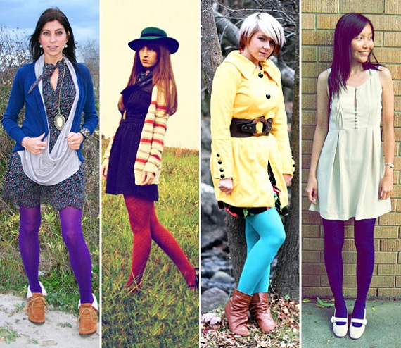 - можно создать контрастный образ, к цветным колготкам подобрать верх противоположного оттенка, главное не перестараться.