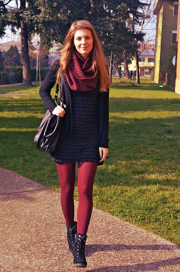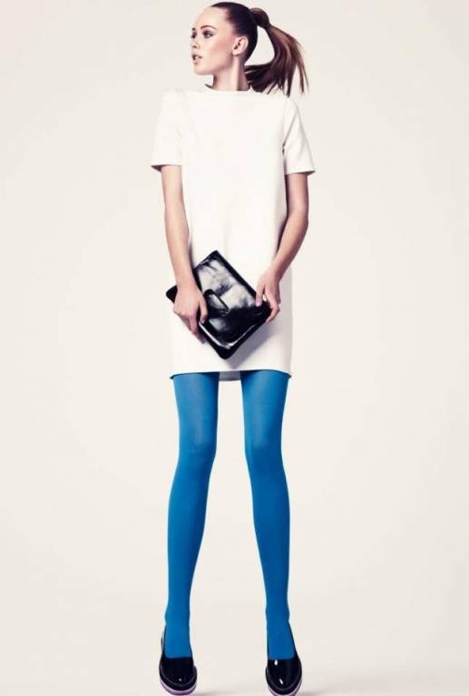 - так же такие колготки можно сочетать с верхом того же цвета, если только это не ярко – ядовитый оттенок, такой как желтый или красный. Хорошо будут смотреться синие и фиолетовые колготки с таким же верхом, можно добавить аксессуар другой цветовой гаммы, например голубые колготки и голубой свитер, а шарфик желтого цвета, это будет ярким интересным акцентом.