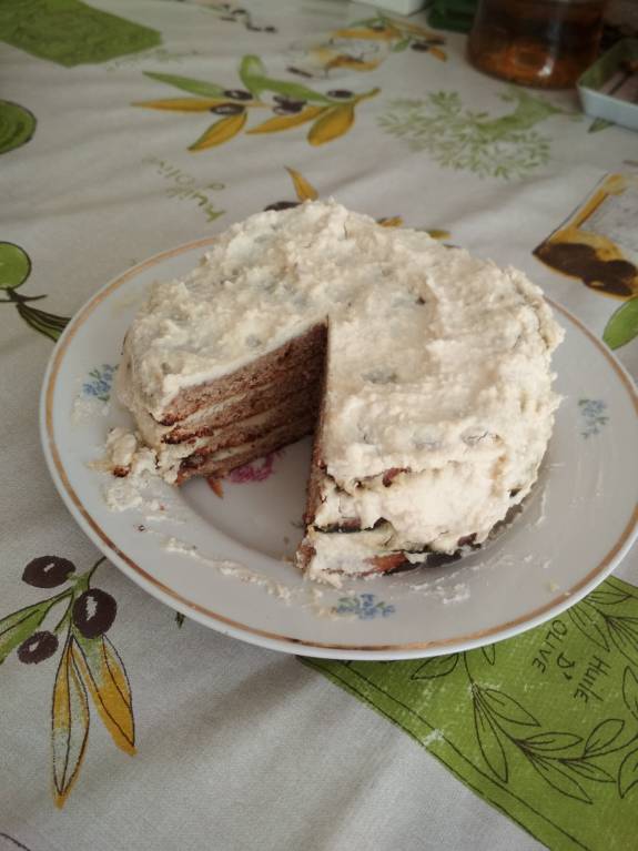 Угробила вчерашний вечер на тортик с творожным кремом. Ровно положить крем не получилось, но съедобно.