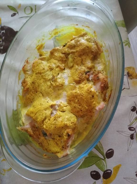 А моя семья пост не соблюдает, поэтому я своим отбила куриные грудки, завернула в них заранее потушенные овощи - получились такие "корзиночки" или большие хинкали - и облила их сметаной с куркумой, карри и чёрным перцем. И в духовку. Вот что получилось:
