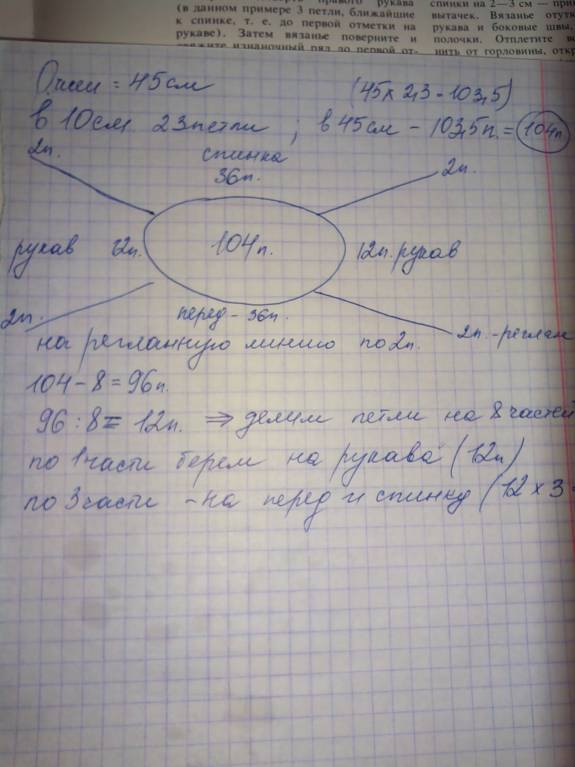 Рукава - 1/3 всего объема? Подрезы делать необходимо! Подрезы - это петли подмышкой, набираются после отделения рукавов. Если их не делать, будет неудобно носить. Странно, что у Максимовой ты этого не прочитала. Давай ты напишешь сюда то, как рассчитываешь, а я напишу, что неправильно. Росток вяжешь?