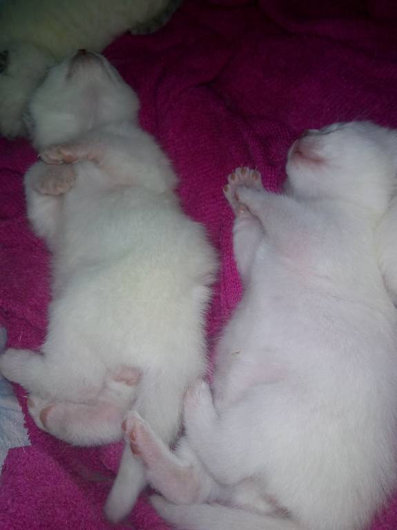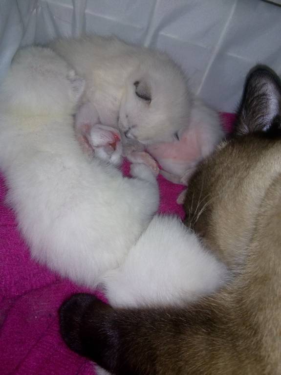 Их преображение из белых комочков в сиамцев завораживает: сначала шерсть на ушках стала темнеть,открылись глазки, теперь и хвостики темнеют))) Пузики розовые,так чУдно!