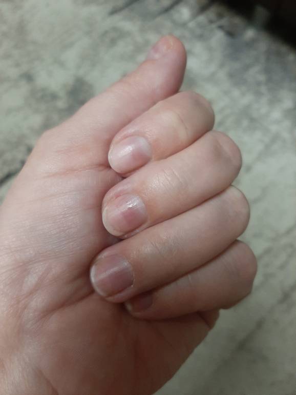 Я вроде так особо ничего ещё не мыла с химией, но ногти расслоились, заусенцы стали дыбом. Хорошо, щипчики и пилку не забыла дома. Отрезала и спилила под корень все ногти, обрезала кожу, намазала кремом - вот и вся красота.