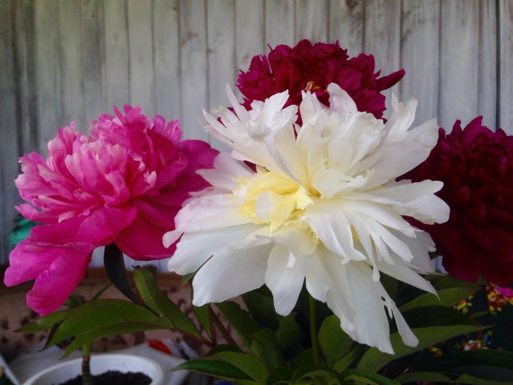 Фавориты -- пион "Айсберг", "Анастасия", "Бесси", "Вивид Роуз", "Виктория", "Боул офф Бьюти", "Диана", "Сара Бернар" и "Май лав"