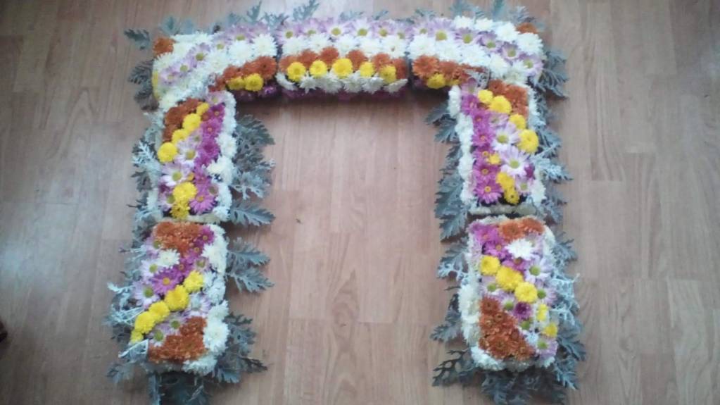 А вот на Покров делала. Тоже из того что было- много - много хризантем и цинерария. Понимаю , что не профессионально. Не хватает мне знаний и навыков. Что вижу , то и делаю