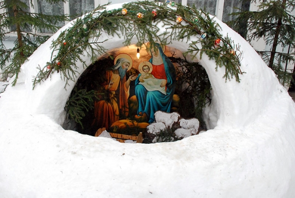 Пару лет назад в Омске видела такой вертеп: из снега и, наверное, льда, сделана пещера, а в ней фигуры животных изо льда