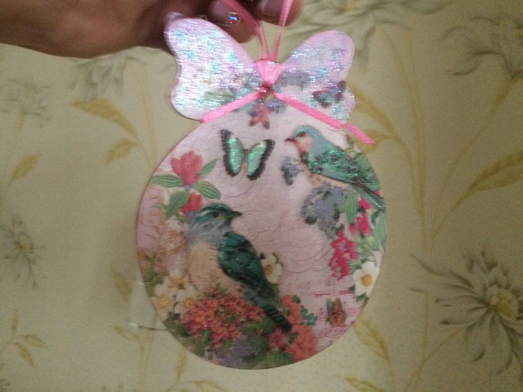 Я же сама за её открыточку, на мой взгляд она из самой сложной техники...для меня просто дебри! Просто увидела птичек, листики-цветочки...и ещё и бабочки! И даже не обратила внимания, что открытка сделана в Форме ёлочной игрушки!