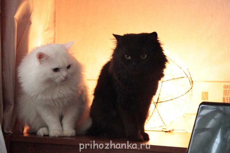 У нас дома сейчас живут два кота. Один - перс, ему уже 12 лет почти, Барсик. Очень умный, бойкий. Второй - Мячик, ангор. Ему 6,5. Очень ласковый и трусливый.
