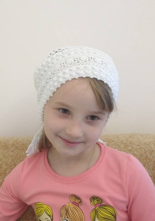Закончила повойник,вязала себе,но дочь выпросила.Ну,говорю,тогда будешь моей моделью.