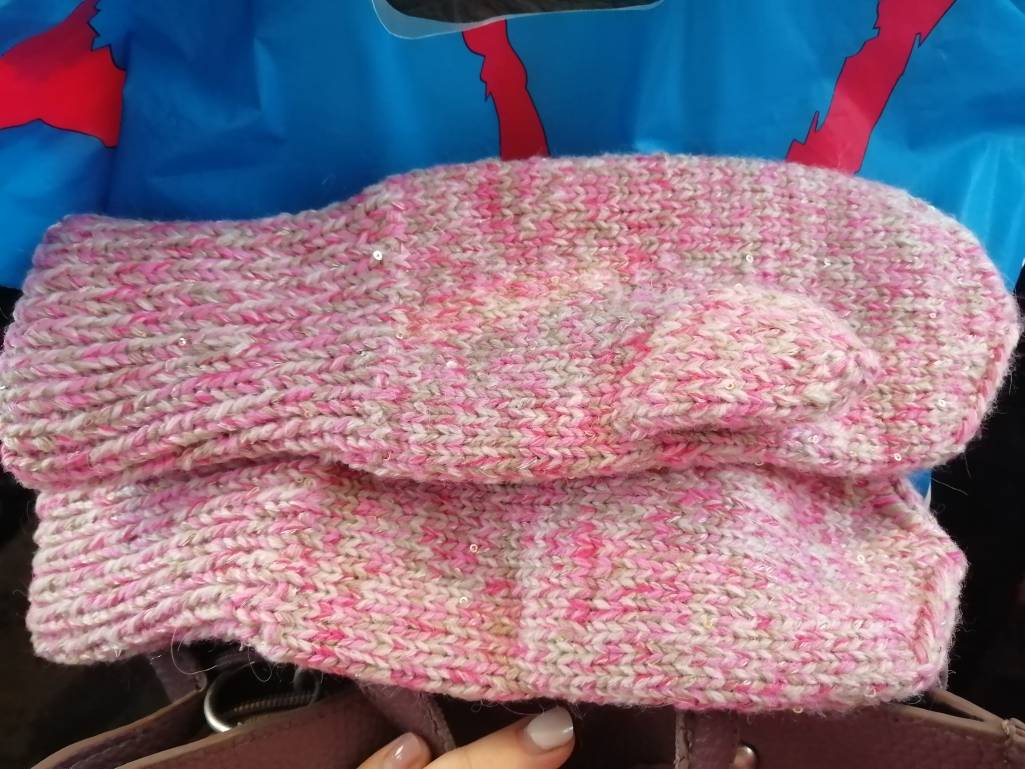 Чем ещё хороша бобинная пряжа - есть возможность делать интересные миксы из пряжи. Эту смотку "собрала" сама - в ней и меринос, и ангора, и кашемир, и искусственных составов немного, и пайетки. Несмотря на то, что варежки тонкие, они тёплые. Сейчас 25 градусов мороза и мне тепло в них.