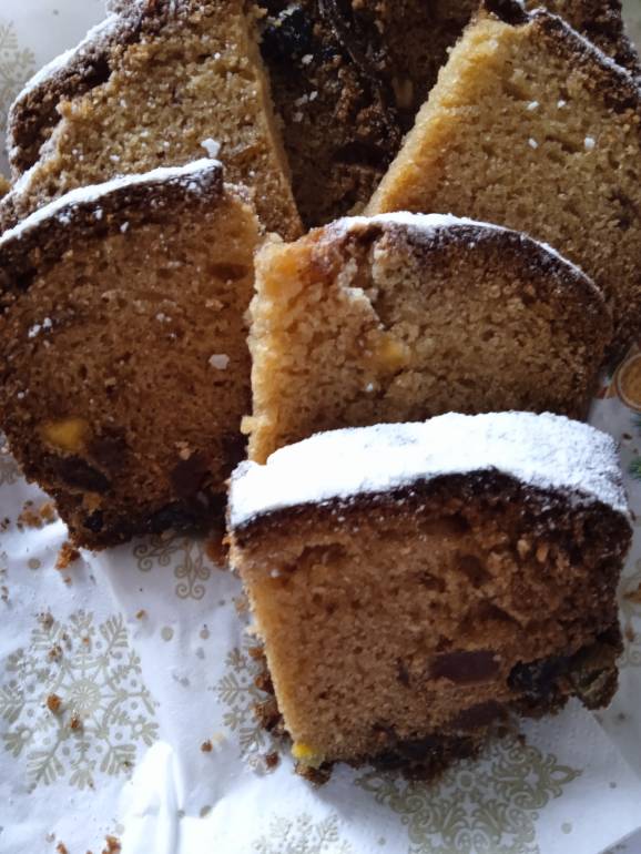 Я так штоллен и не сподобилась ни разу сделать. Купили все к бисквитному торту. Как обычно делаю, Лида просила такой испечь. Обычный бисквит пеку, пропитываю разбавленным сиропом из под ананаса. Крем взбиваю масло с сгущенкой и бананом. Прослаиваю коржи этим кремом и кусочками консервированных ананасов.