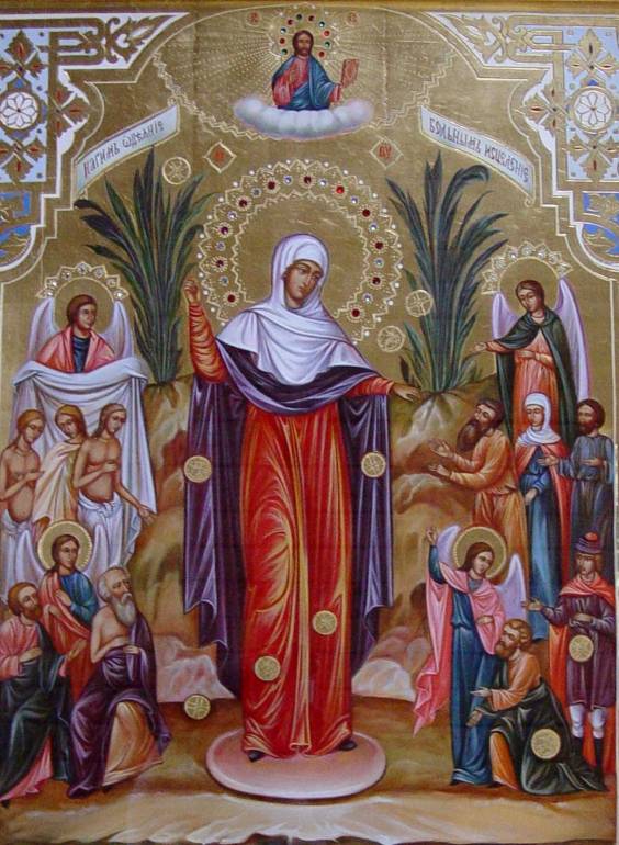 Иеромонах Даниил изобразил Богоматерь, сидящую на облаках с распростёртыми руками, в привычном для себя академическом стиле живописи. Образ Богоматери был взят с иконы «Всех святых» из Богородично-Всехсвятского монастыря Орловской губернии. Нижнюю часть иконы занимал натуралистический пейзаж с уходящим вдаль хлебным полем и снопами ржи.