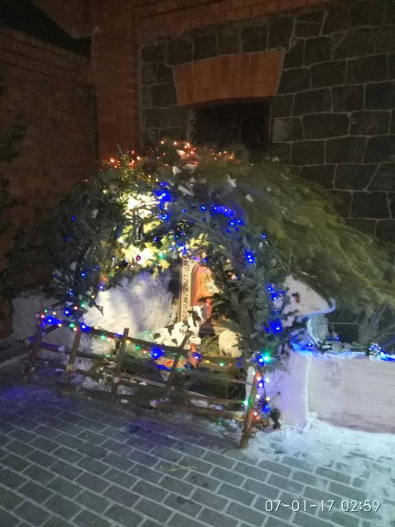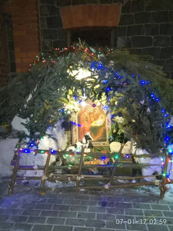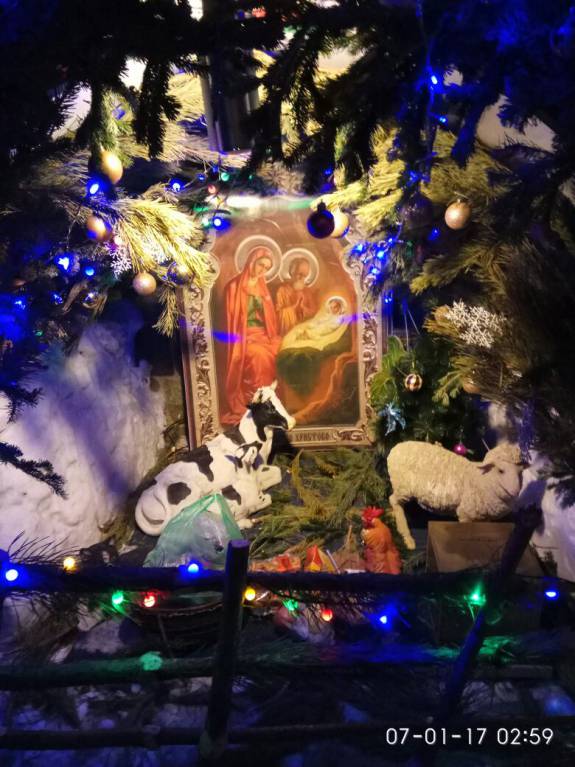 У нас возле храма каждый год вертеп мастерят. Делают обычно из сугроба. А в этом году напились из спресованного снега. Очень красиво. Правда фото после ночной праздничной Литургии. Может не все видно. Могу потом днем сфотографировать.
