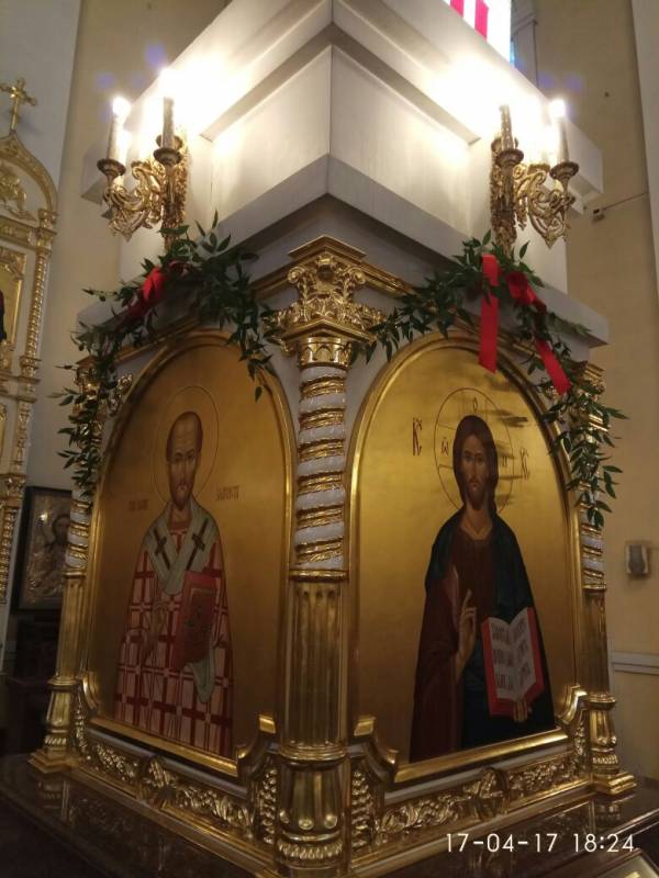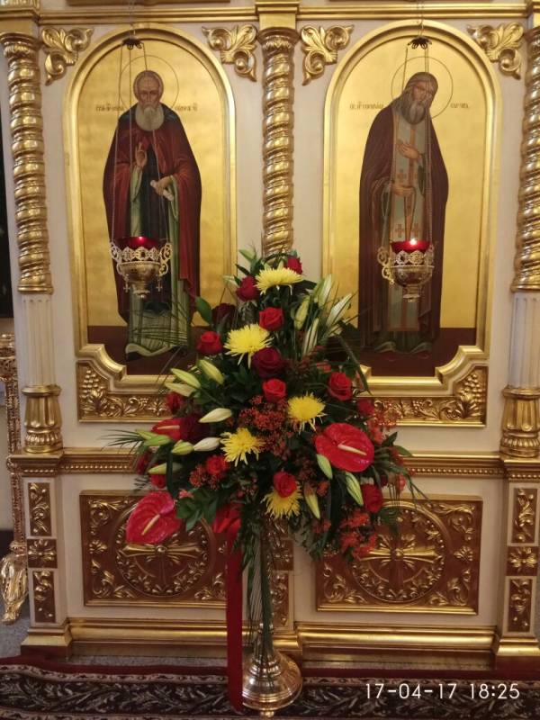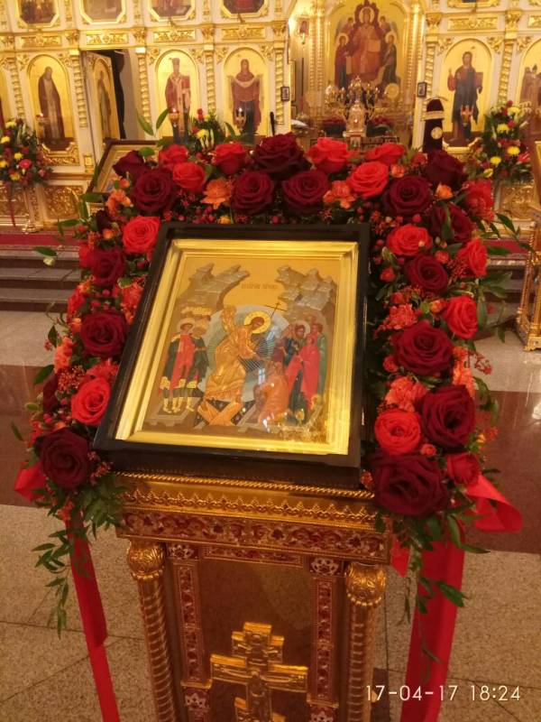 У нас в храме выставляются большие фигуры(не знаю как иначе сказать) Христа,Богородицы и Ангелов и ставят вазоны и вазы с цветами...вот так украшают....