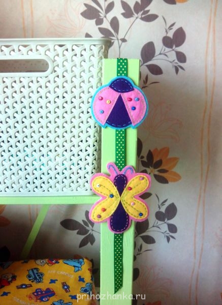 ) и я еще насекомых сшила. Дома наклеила их на тесьму и повесила на детский стеллаж для пеленок-ползунков. Стеллаж у меня пока еще не закончен, буду еще шить карман для носочков . В корзинках ползунки и распашонки лежат, пеленки просто стопочкой на полке сложены.