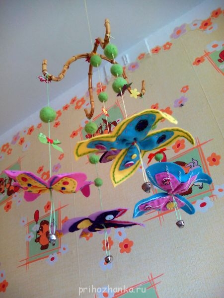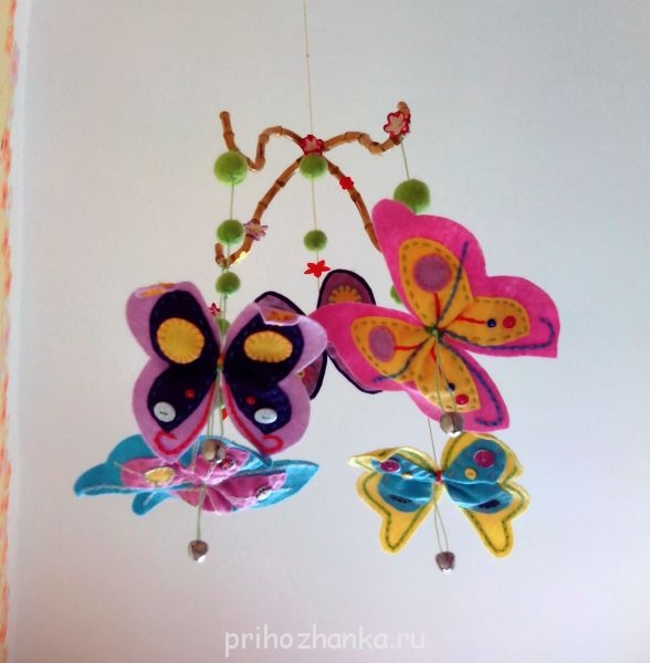 К бабочкам приделала бубенчики, они звенят, когда за мобиль задеваешь. Так же мобиль очень легкий, за счет чего он подвижен , от движения воздуха колышется и расстановка бабочек меняется.