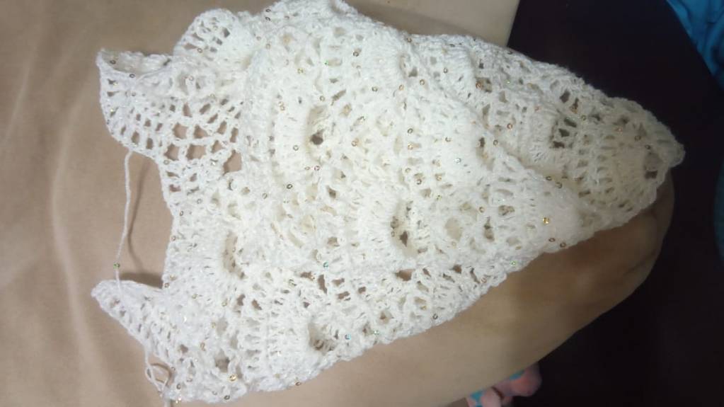 4. Платье внучке. Распускала и начинала раз пять, пока не "вписалась" в размер. Связано 20 рядов.