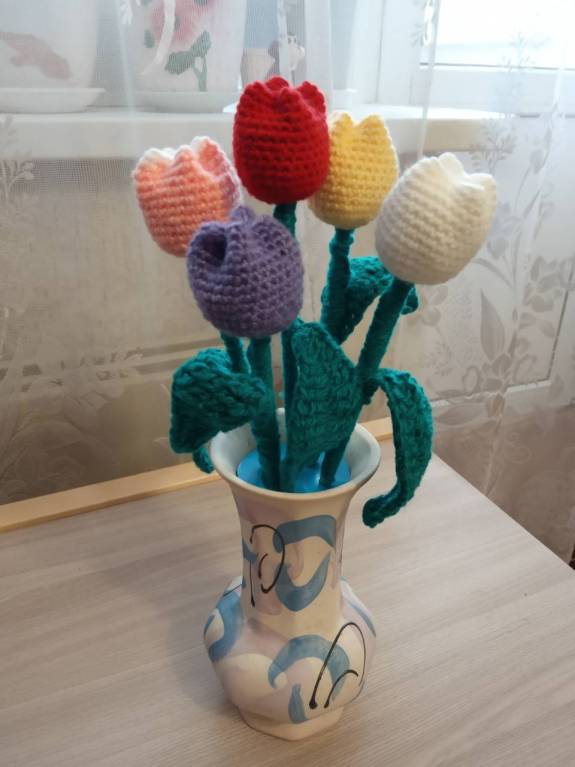 5. Не запланировано, но срочно к понедельнику в садик внучке надо было связать что-то весеннее. Придумался букет тюльпанов.