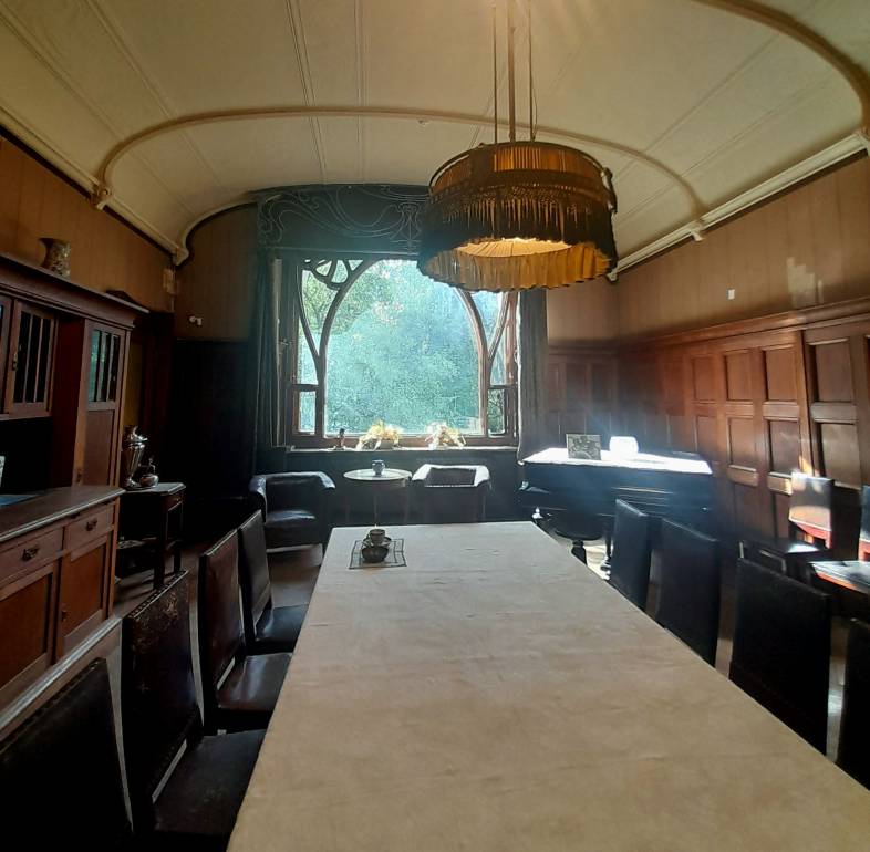 Внутри роскошный особняк, интерьеры, большие залы и красиво обставленные комнаты.
